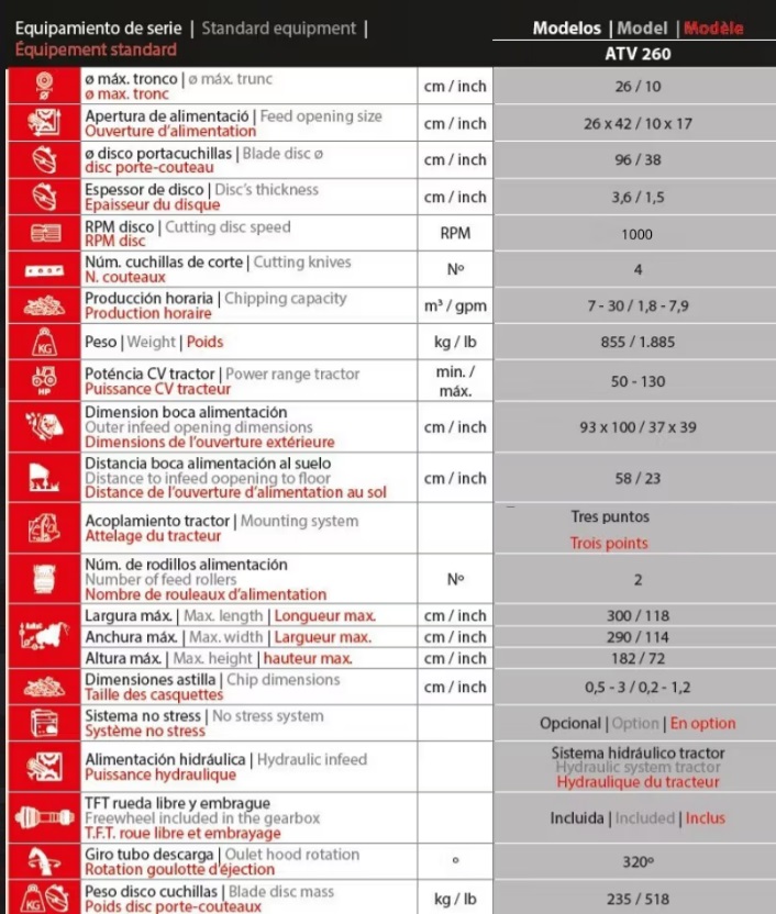 La Astilladora de Madera Forestal A.T.V. 260 es la astilladora más profesional y robusta de esta gama y sale a petición de los clientes más exigentes.