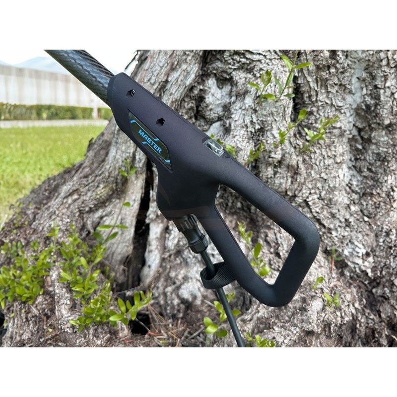 La empuñadura específica para MASTER PLUG-IN ofrece tres modos de agarre (dos manos en alargadora, una en empuñadura y otra en alargadora, o una sola mano en base), eliminando vibraciones y facilitando control preciso durante jornadas intensivas. Incorpora interruptor ON/OFF y fusible de protección, integrándose perfectamente con cabezal doble peine de carbono y motor de 350 W o 1200 rpm a 12 V. Se suministra como repuesto original para mantenimiento de vareadores en olivares variados.