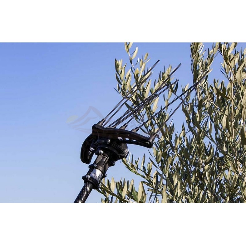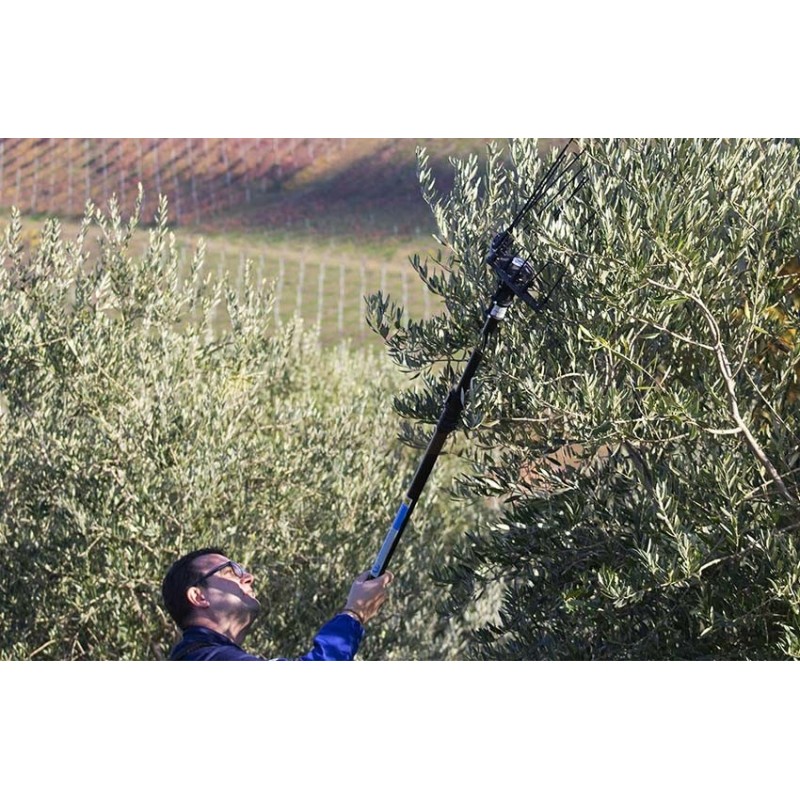 Cosechador eléctrico HERCULES 6 ECO PLUG-IN de Campagnola, con velocidad de 1200 rpm a 12 V y consumo de 7-8 Ah, diseñado para recolección profesional de aceitunas en olivares grandes.