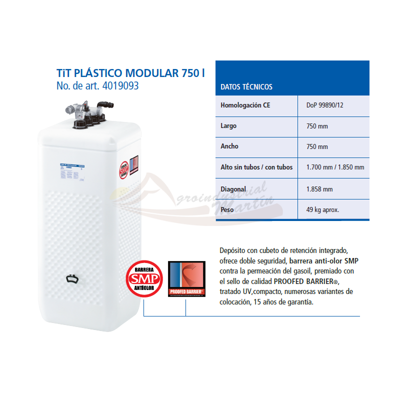 Depósito con cubeto de retención integrado, ofrece doble seguridad, barrera anti-olor SMP contra la permeación del gasoil, premiado con el sello de calidad PROOFED BARRIER®,
