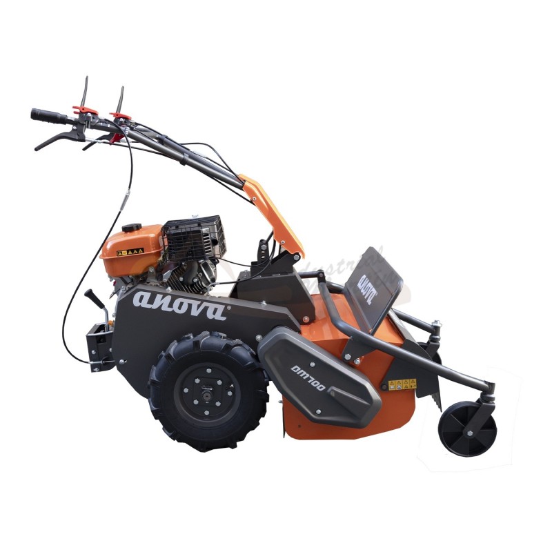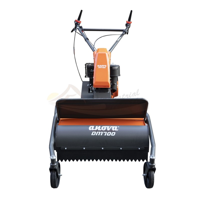 Desbrozadora de martillos ANOVA DM700 con motor 4T de 302 cc (EURO V), 36 cuchillas y ancho de corte de 700 mm. Equipo robusto, autopropulsado y diseñado para trabajos de desbroce pesado en terreno con maleza espesa y vegetación densa.