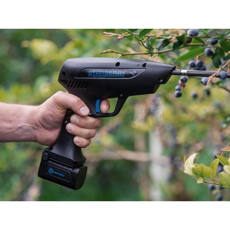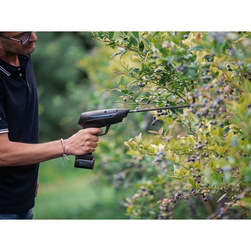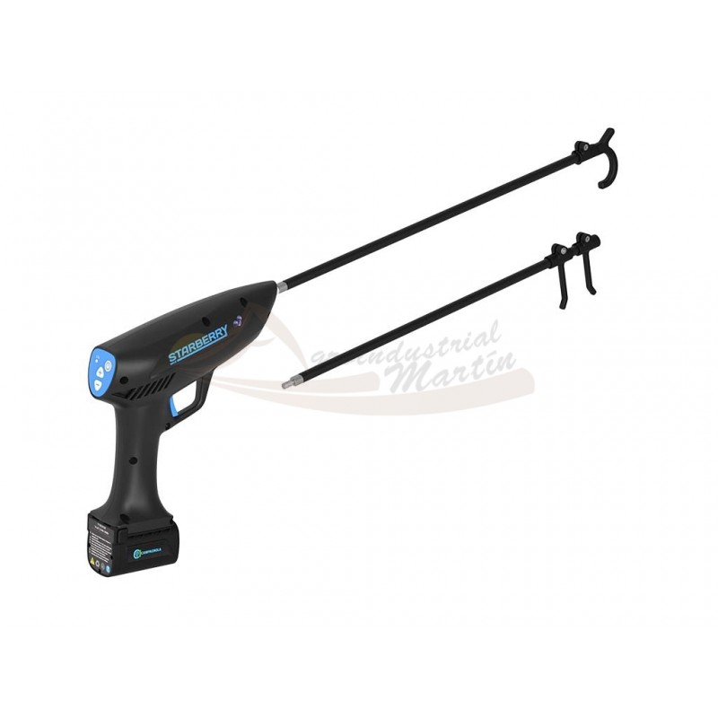 STARBERRY MD2 permite al operario acercar el gancho a la planta para vibrar y desprender arándanos de forma sencilla y rápida, resolviendo limitaciones de la recolección manual mediante ausencia de bayas en suelo, mayor eficiencia y mantenimiento de integridad sin manipulación humana. Este innovador vibrador eléctrico optimiza productividad en plantaciones de bayas, compatible con baterías Li-Ion plug-in y selector de frecuencias para adaptarse a densidades variadas.