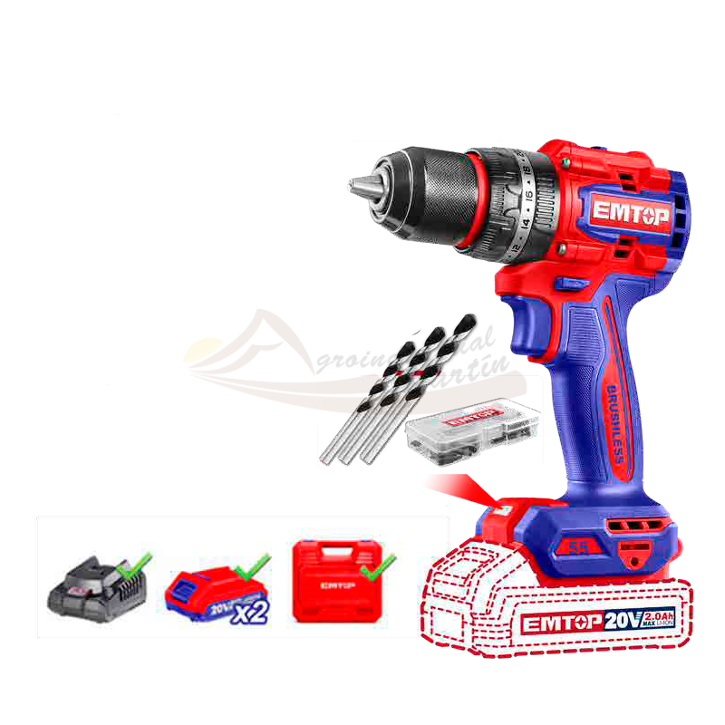 Taladro percutor inalámbrico EMTOP P20S de 20 V con par máximo de 55 Nm y selector 22+1+1, suministrado en kit con 2 baterías de 2 Ah, cargador y maletín para trabajos de atornillado y taladrado con percusión.