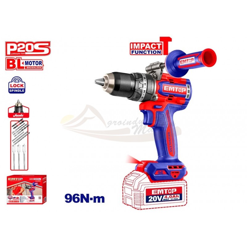 El taladro percutor a batería EMTOP ECIDL209681 (plataforma P20S) está pensado para trabajos de montaje, mantenimiento y uso general, combinando potencia y versatilidad en un formato inalámbrico.
