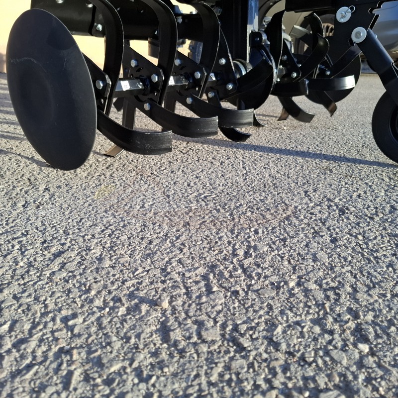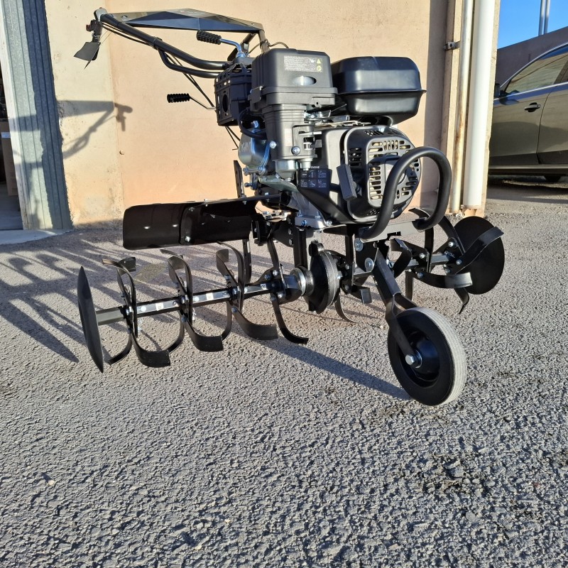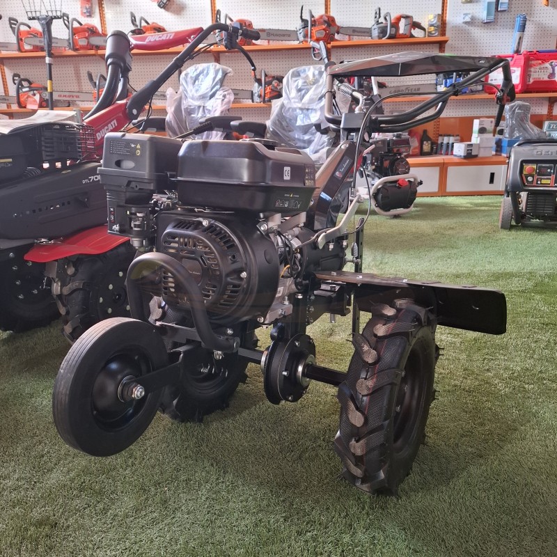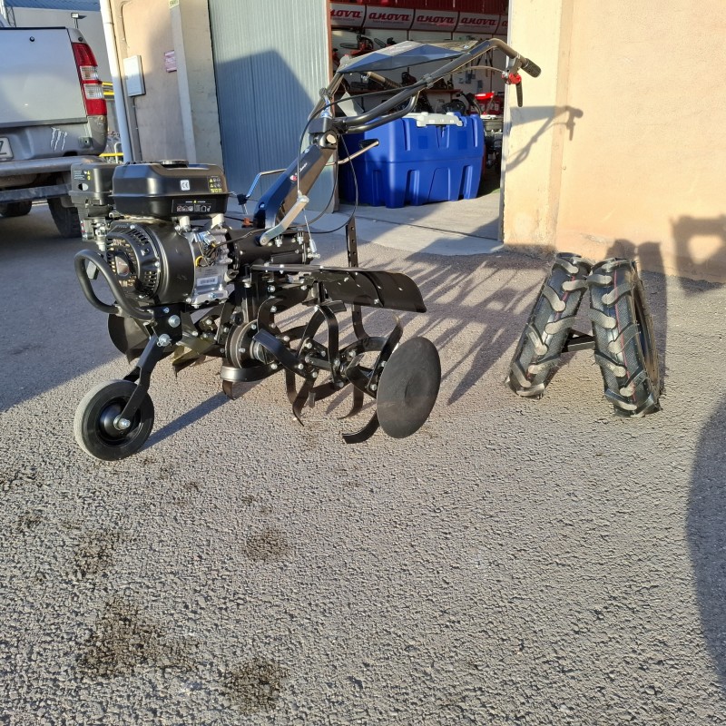 Características: - Motor (EUV) - Marchas: 3+1 (atrás) - Filtro de aire en baño de aceite - Sistema seguridad auto-pare - Manillar regulable - Transmisión mecánica directa - Equipo de fresas montado - Juego de ruedas 400 x 8" - Discos laterales - Guía de profundidad