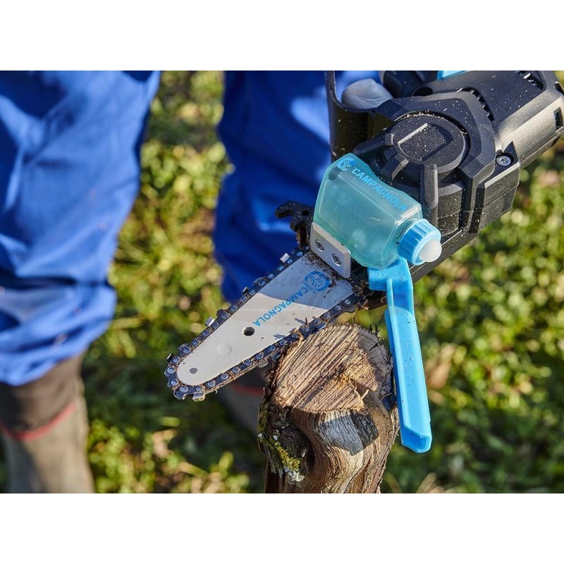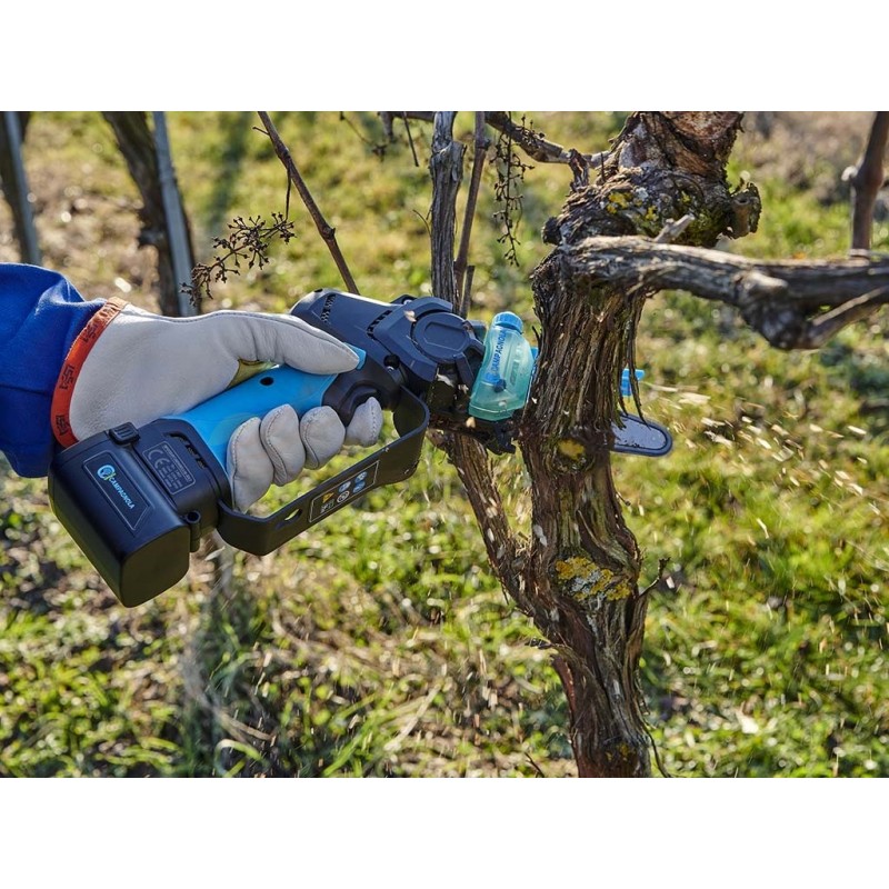 El T-REX es un podador eléctrico de cadena compacto de la línea Green Line de Campagnola, con reducidas dimensiones y bajo peso que no comprometen su alta capacidad de corte en cualquier condición de uso. Su potente motor brushless de 470 W garantiza rendimiento profesional en frutales y viñedos, facilitado por la batería incorporada que permite movimientos libres. Incluye lubricación manual para suavidad en la cadena, empuñadura antideslizante con interruptor de seguridad y protección contra rebotes, asegurando fiabilidad y seguridad para el operario.