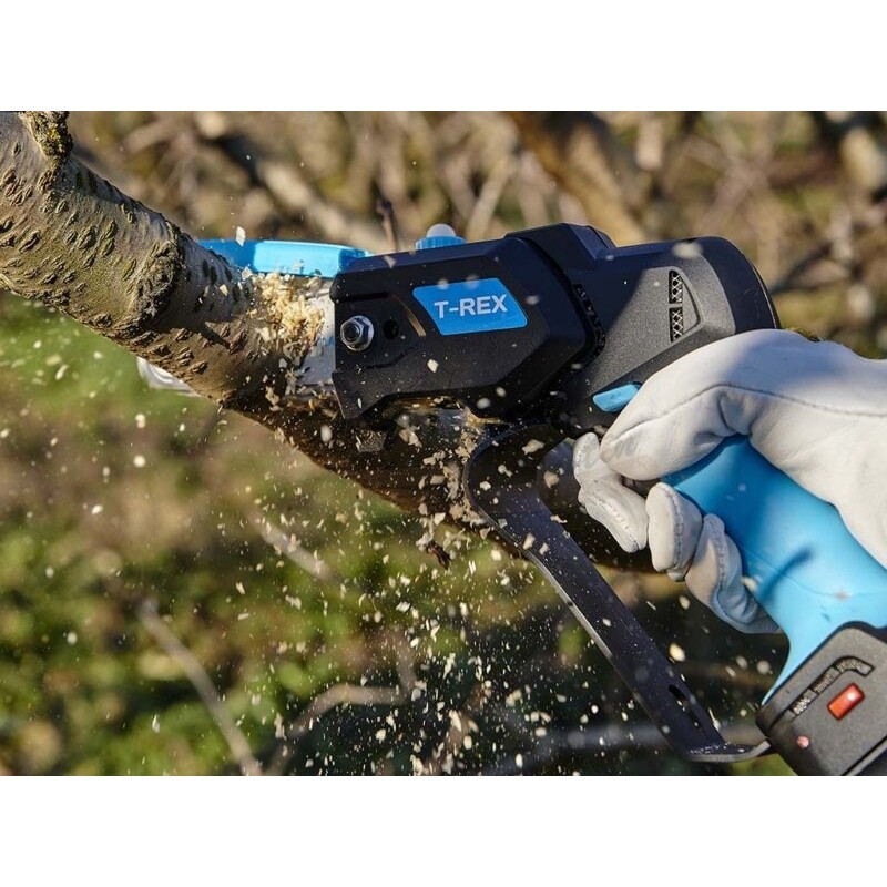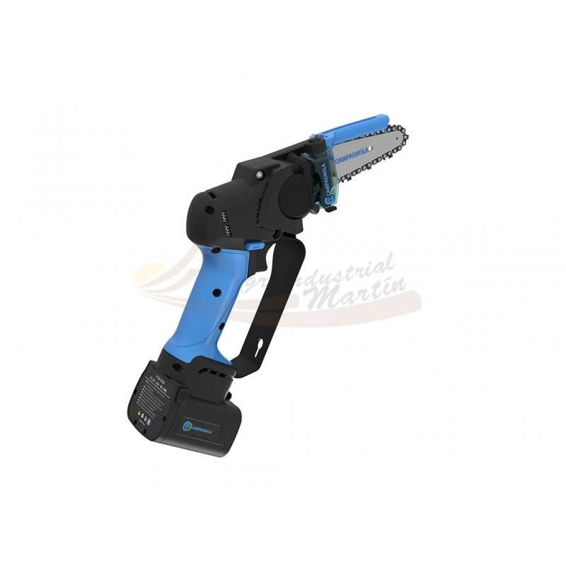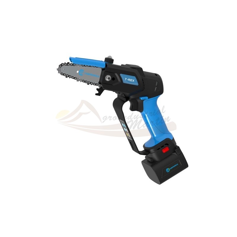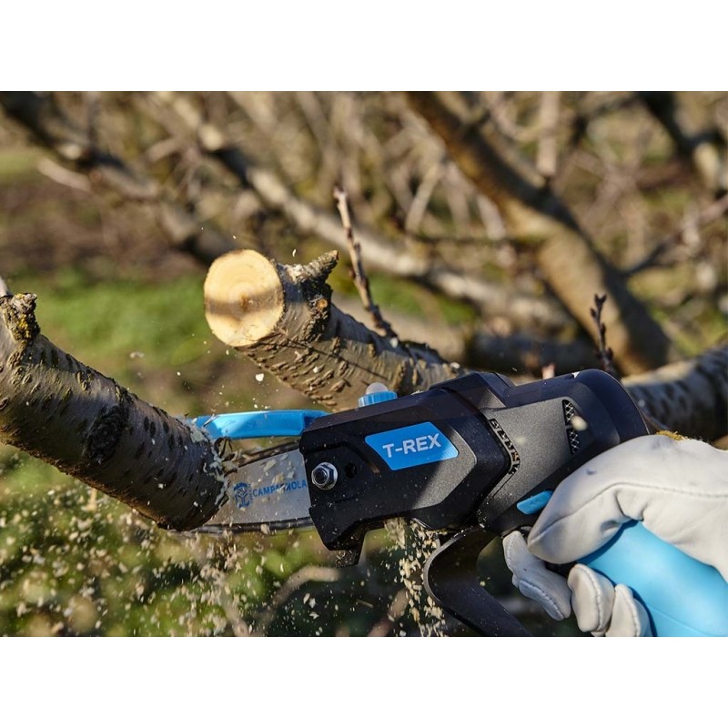 Podador eléctrico de cadena T-REX de Campagnola, compacto y ligero con motor brushless de 470 W, diseñado para poda en frutales y viñedos con cortes rápidos y precisos.