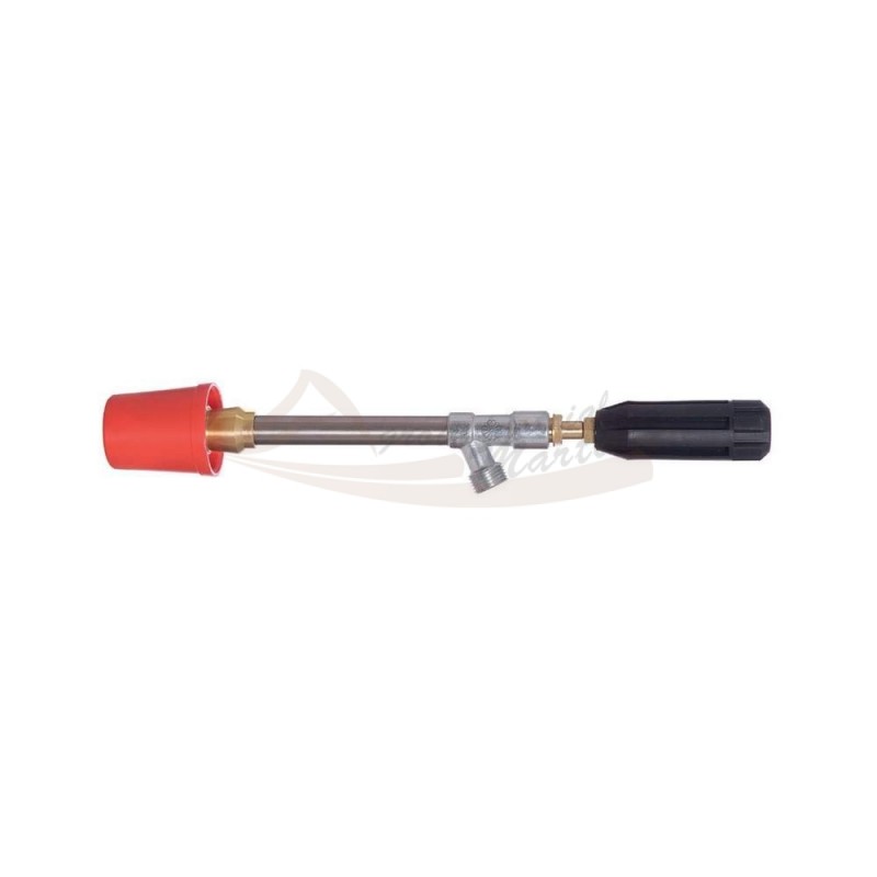 El Pistolete Sin Fin Campana Mediana combina tubo flexible continuo de 30 cm con campana difusora mediana roja de 1,5 mm, ideal para pulverizaciones uniformes en viñedos, huertos e invernaderos donde se necesita alcance variable sin articulaciones.