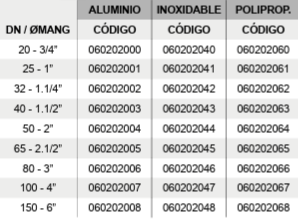 Se utilizan en 3 materiales principales: aluminio, acero inoxidable AISI316 y polipropileno con un 30% de fibra de vidrio. Las juntas son de NBR habitualmente.