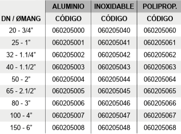 Se utilizan en 3 materiales principales: aluminio, acero inoxidable AISI316 y polipropileno con un 30% de fibra de vidrio. Las juntas son de NBR habitualmente.