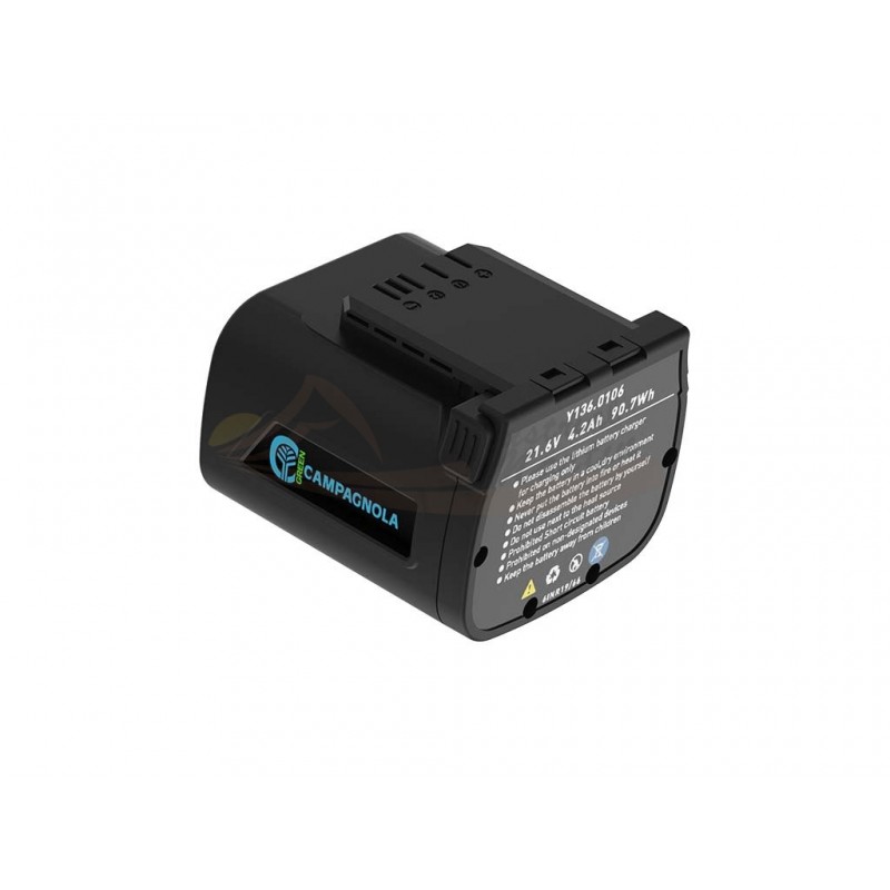 Batería para TYSON XL, T-REX y T-FOX de Campagnola, de iones de litio plug-in con 21,6 V (25,2 V máx.) y capacidad de 4,2 Ah, disponible en la línea Green Line del catálogo oficial.