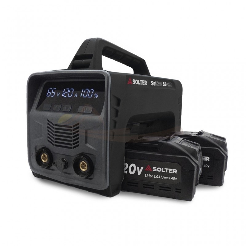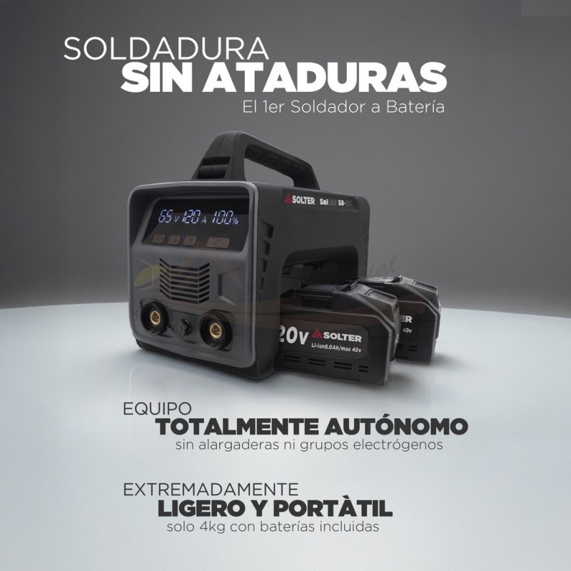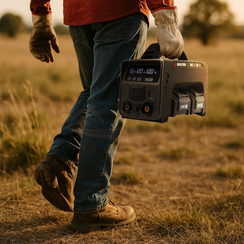 El SOLBAT SB-120V de SOLTER es un equipo de soldadura MMA profesional a batería, ideal para trabajos en zonas sin acceso a red eléctrica. Con una corriente de 120A, permite realizar soldaduras eficientes con hasta 7 electrodos de 2,5 mm o 14 de 2 mm con una carga completa de 2 baterias. Dispone de sistema de conexión Dinse 10-25 y sus dos baterías Li-ion (2x40V) de 8Ah se recargan simultáneamente mediante el cargador dual incluido. Compacto, robusto y con pantalla digital integrada, es la solución perfecta para intervenciones en campo, mantenimiento o trabajos en exterior donde no llega la corriente eléctrica.