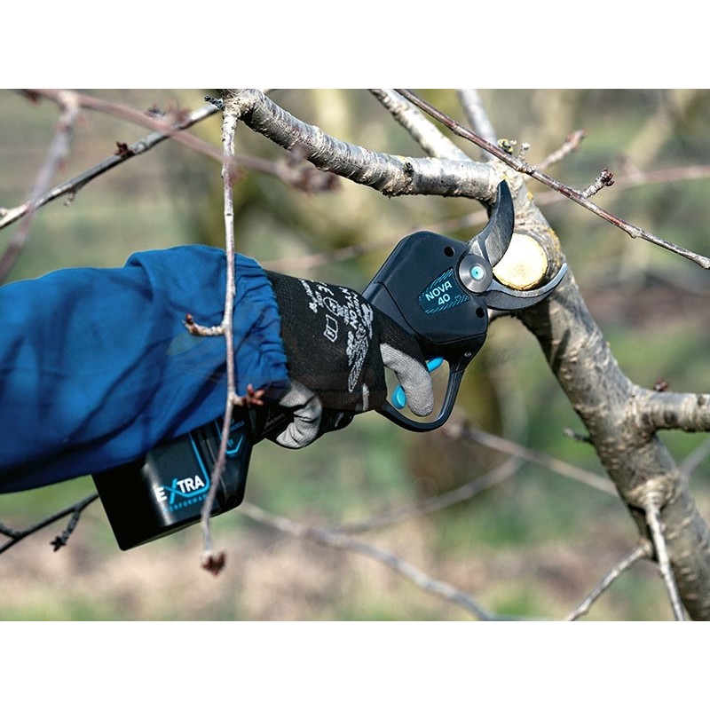 La NOVA 40 es una tijera eléctrica profesional diseñada para trabajos exigentes de poda donde se requiere gran diámetro de corte y alta autonomía. Trabaja con baterías de iones de litio de 21,6 V nominal (25,2 V máx.) en capacidades de 2,5 y 5 Ah, ofreciendo de 2 a 3 horas de autonomía por batería según el tipo de madera. Pesa 0,8 kg sin batería, 1,2 kg con la de 2,5 Ah y 1,3 kg con la de 5 Ah, manteniendo un diseño ligero con corte progresivo, cambio rápido de amplitud de cuchillas y posibilidad de gestión mediante app para optimizar el uso en campo.