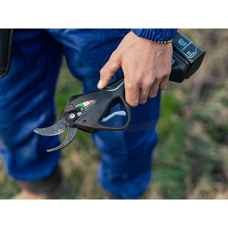 Tijera eléctrica NOVA 40 de Campagnola, ligera y rápida, con capacidad de corte hasta 40 mm y funcionamiento a 21,6 V con baterías de 2,5 o 5 Ah.